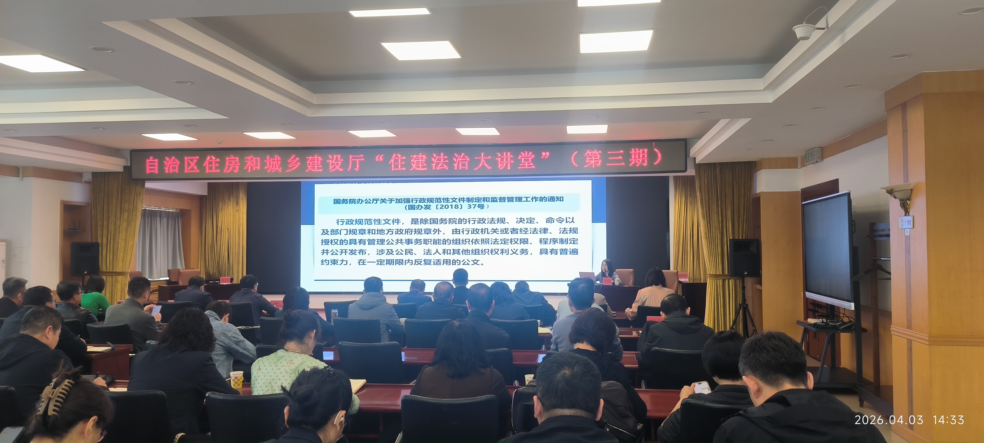 为深入贯彻落实自治区全面依法治区委员会办公室关于加强行政规范性文件管理专项治理工作部署要求,进一步提升厅系统干部法治思维和依法行政能力,规范行政规范性文件制定、管理和备案工作,自治区住房和城乡建设厅举办第三期“住建法治大讲堂”专题学习活动,特邀自治区司法厅备案审查译审处负责人作专题授课,厅系统相关干部参加学习。