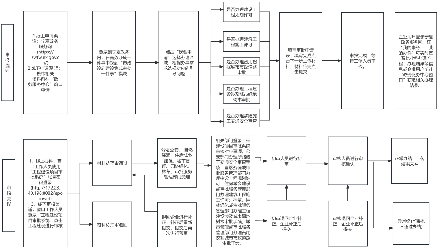 (四)协同集成审核。建设单位通过线上或线下提交材料后,由综合窗口统一收件,通过宁夏工程建设项目审批管理系统分发至公安、自然资源、住房城乡建设、城市管理、园林绿化、林草等部门办理,实现市政设施建设手续全流程“一网通办”。审核通过后,公安部门出具涉路施工交通安全审查手续;自然资源或审批服务管理部门出具建设工程规划许可证;住房城乡建设部门或审批服务管理部门出具建筑工程施工许可证;城市管理部门、住房城乡建设部门或审批服务管理部门出具占用挖掘城市市政道路审批手续;林草、园林绿化或审批服务管理部门出具工程建设涉及城市绿地树木审批意见书或建设项目占用林地、草地审核同意书。宁夏工程建设项目审批管理系统自动进行结果归集。(自治区住房城乡建设厅牵头,自治区公安厅、自然资源厅、林业和草原局按职责分工负责;完成时限:2026年4月底前)