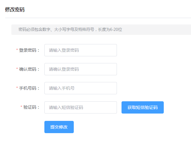 首次登录后,系统会提醒进行密码重置,点击“立即修改”进入密码设置及手机号码绑定界面,设置登录密码(按:密码必须包含数字、大小写字母及特殊符号,长度为6-20位),再次确认后,录入手机号码,点击“获取验证码”验证成功后,密码重置及手机绑定完成。用户下一次登录时,使用重置后密码进行登录。