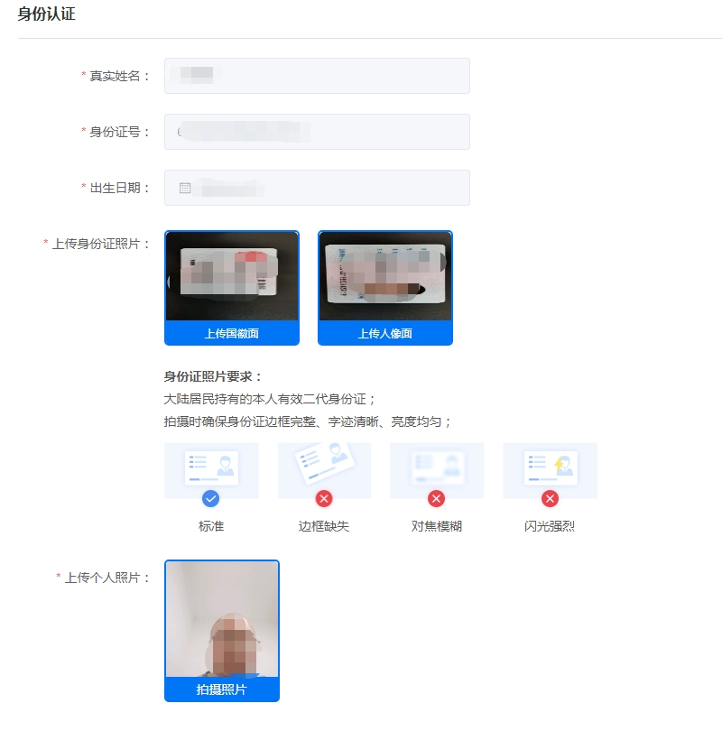 上传材料包括:免冠1寸照片或个人人脸照片、身份证正反面等。