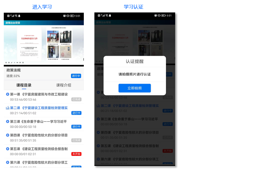 学员在开始学习前,需进行实名认证,上传学员身份证正反面照片,并与学员人脸进行比对,比对成功后,方可进入学习。