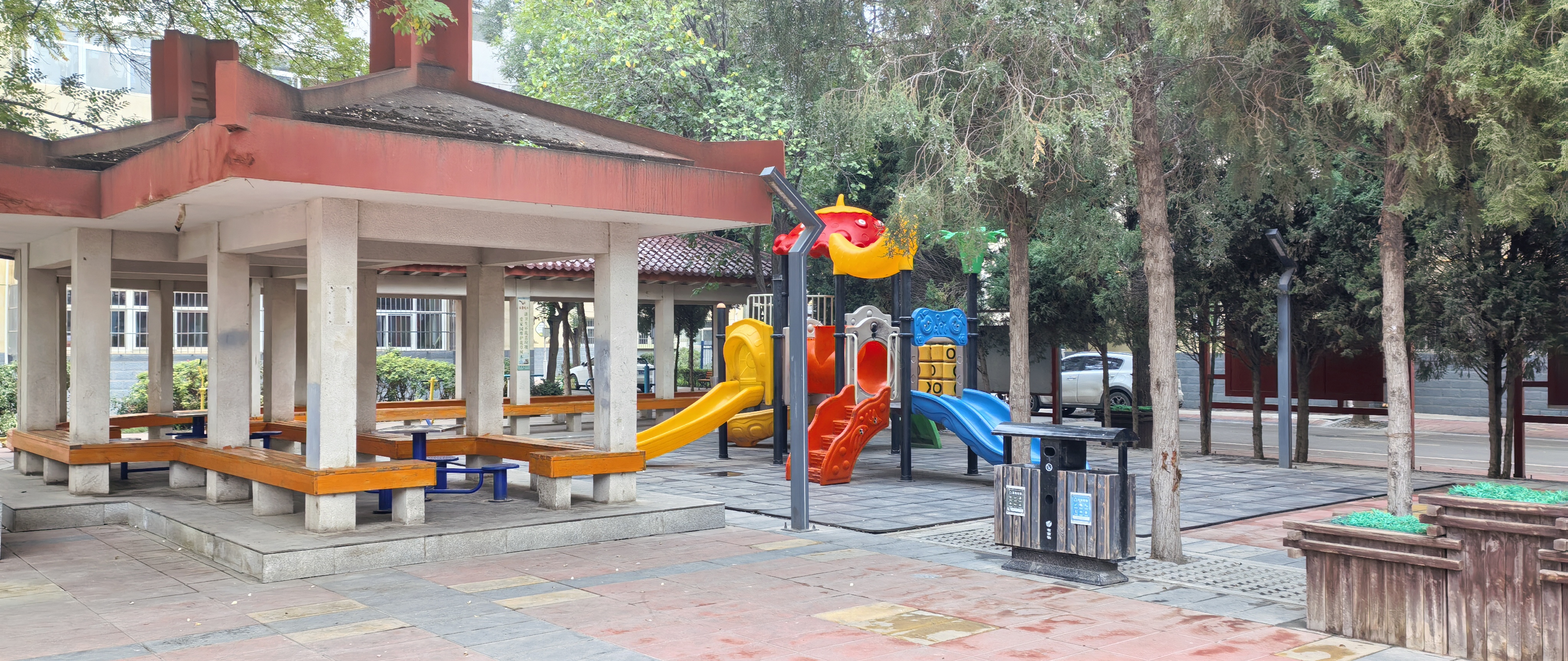 二、打造“推窗见绿”的社区广场小公园。紫薇小区建设年代久远,存在设施老化、绿植分布不均等问题,为此实施“修绿植+提质量”双重改造。将原部分居民违规占用的“菜园子”拔除,保留原生乔木的同时补植多种花草,修改遮挡居民楼视线的过高树木,林木覆盖率达80%,让居民在家门口就能享受天然“氧吧”;小公园内还配套安装多组休闲座椅、遮阳廊架、遮雨棚及便民工具箱等,设置适合老年人的健身步道与儿童游乐设施,串联各活动区域,实现“一老一小”多样化活动需求全覆盖。社区广场小公园的存在既改善了小区生态环境,又为全龄段居民提供了散步、聊天、嬉戏互动的日常休闲场所。