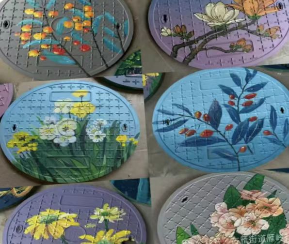 二、精心构思,共创主题多样“景盖”。为保证井盖绘制后效果持久,社区工作人员先是对井盖进行了除锈粉刷处理,经过风干后,志愿者们秉承着“奉献、友爱、互助、服务、进步”的精神,对社区的井盖进行彩绘,利用手中的画笔,围绕 “24节气”“文明环保”“城市文化” 等主题,精心构思图稿,在小区井盖上分别绘制了可爱的动画卡通人物、垃圾分类宣传标语、生态绿化、环境保护等主题多样的作品,绚丽多彩且各具创意的涂鸦使一个个井盖变成了文明宣传的新窗口,为小区增添了一道靓丽的风景。居民们纷纷驻足并对志愿者们的作品给予了赞赏!