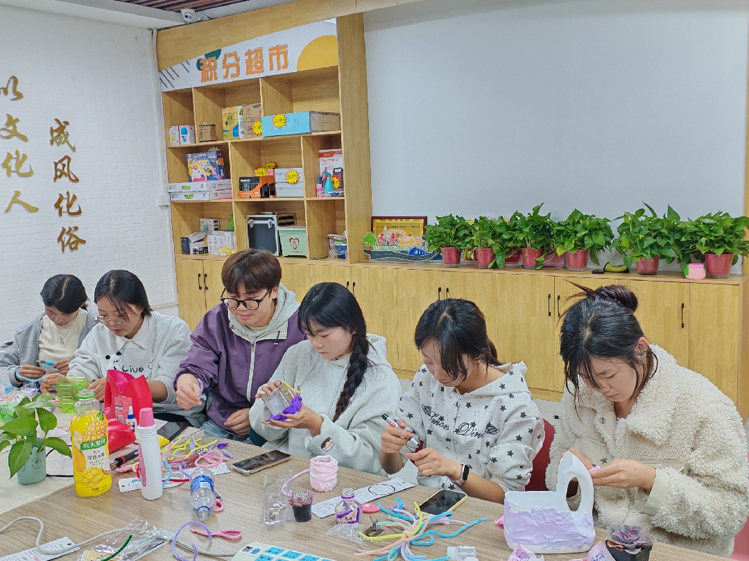 教学环节中,志愿者现场演示“三步造花房”技巧:剪底留身打造花房主体、扎孔防止植物烂根、用粘土和卡纸创意装饰。青少年们迅速投入实践,有人专注裁剪废旧瓶罐,有人合力设计个性造型,有人细心粘贴环保标语,当废旧塑料瓶逐渐变成精致的“小花房”,环保认知也在动手过程中慢慢落地。