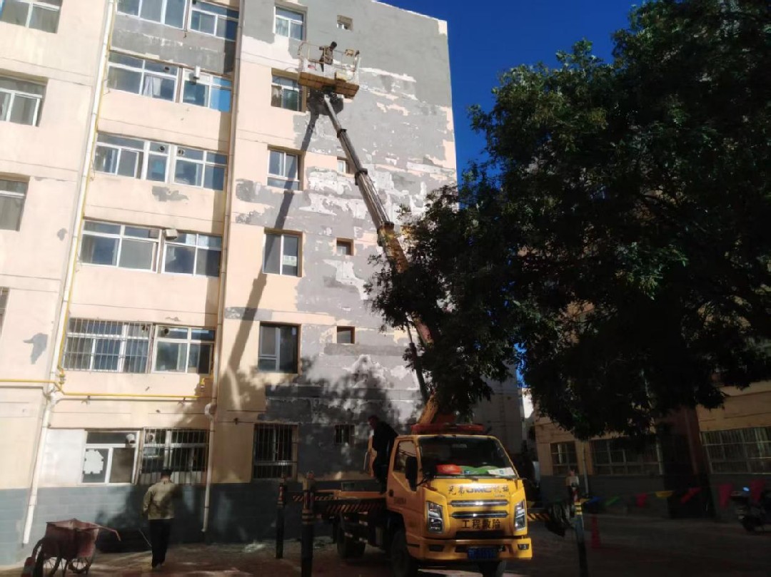 青铜峡市裕民街道紫薇社区针对部分楼栋墙皮脱落情况,社区联合宁夏三建公司和物业工作人员,实施高空作业对脱落墙体进行无偿修补。