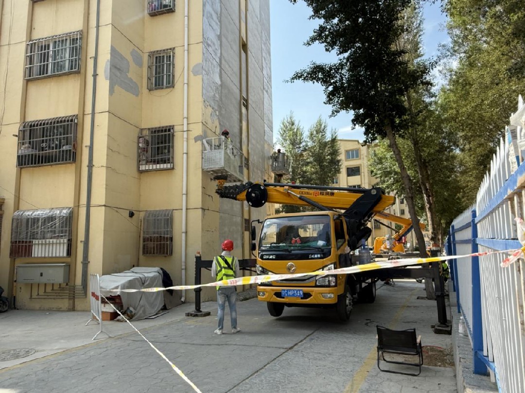 坡头区长安社区针对挑檐墙皮剥落、结构松动的安全隐患,维修人员借助高空作业车清除松动墙皮、加固基层、重新抹灰粉刷,既消除高空坠物风险,也让楼体外立面焕然一新。