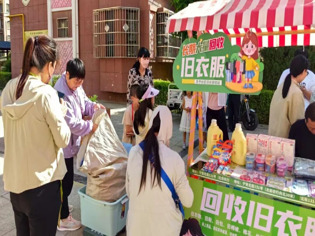 中宁县红苑社区协调物业定期回收社区居民旧衣服。