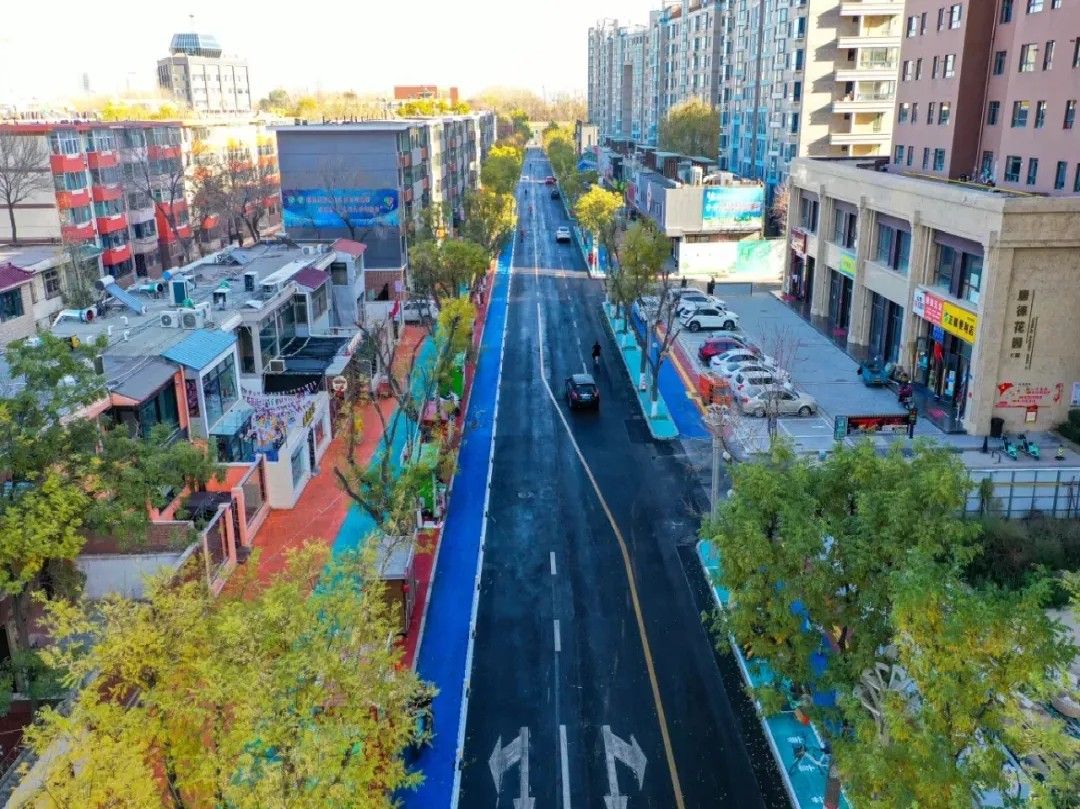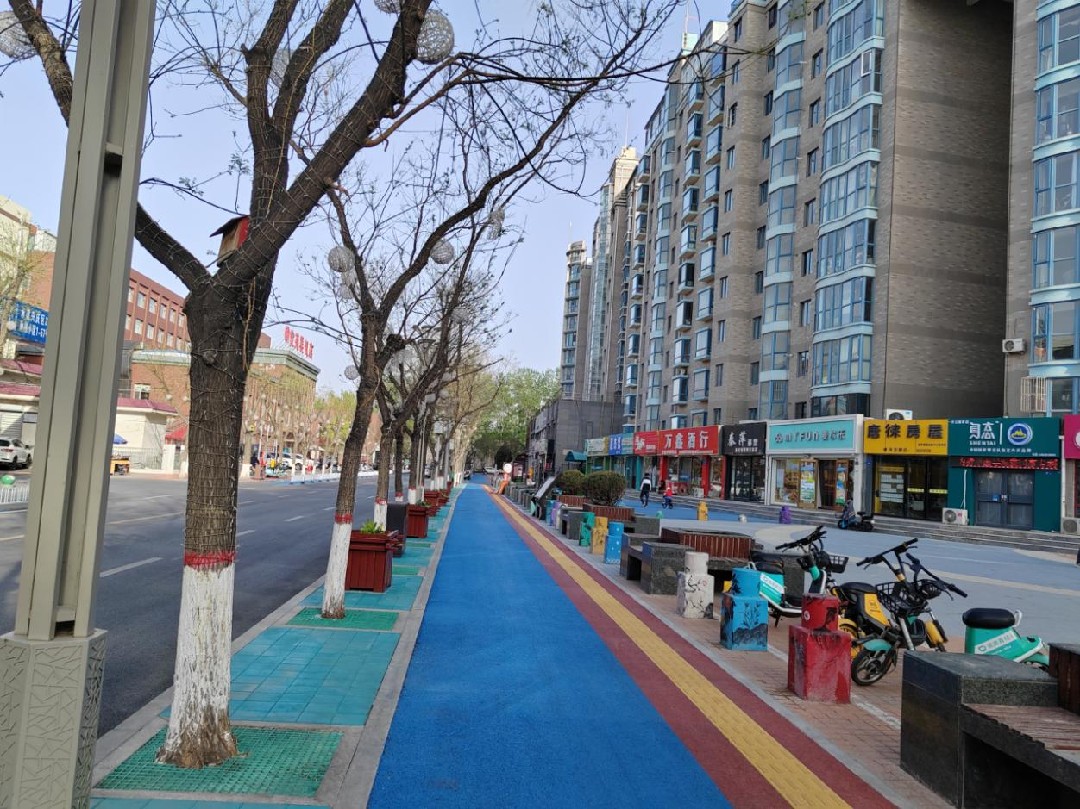 将兴庆区新民巷、兴仁巷作为核心慢行通道,向小区楼栋、院落纵深延伸,铺设2400米彩虹慢行步道。红蓝分色设计不仅美观醒目,更实现人车物理隔离,保障通行安全。同时,将慢行系统与社区公共服务有机衔接,全线贯通党群服务中心、社区卫生服务站、幼儿园、银龄广场、社区食堂、唐徕老街坊、唐徕印记馆等服务场所,串联起养老、医疗、教育、文化、健身等功能,织密“15分钟便民生活圈”。沿线嵌入文明宣传、健康知识、垃圾分类等公益内容,并配套夜间照明、盲道、儿童乐园和休闲座椅,满足老年人、儿童、残障人士等全龄群体出行需求。步道启用以来,唐徕片区早晚高峰通行效率提升40% ,绿化覆盖率提升至30%,彩虹步道已成为居民晨练、接送孩子、邻里散步的首选路径。