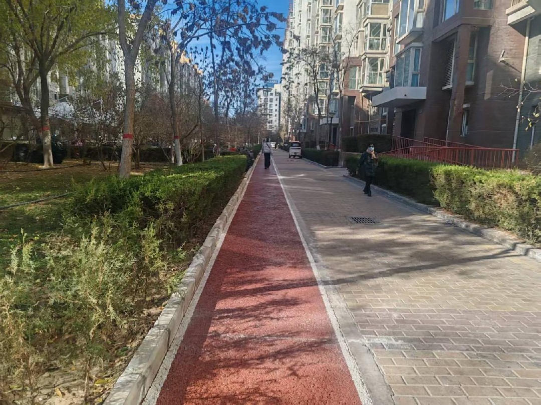 “小区老人多,想找个平整的地方散步都难;孩子们放学想跑一跑,又担心人车混行不安全。”在社区“听民声 为民生”民主议事会上,居民们的诉求直接推动了慢行系统建设。作为完整社区建设的重要组成部分,社区党委通过“1+3+N”民主协商机制,广泛征集意见,最终确定以健康步道改造为核心,打造全龄友好的慢行空间。此次改造聚焦实用性和安全性。施工人员拆除了1-9号楼周边破损的石砖路面、道牙及垫层,浇筑混凝土垫层,铺设彩色透水混凝土路面和大理石道牙,既解决了雨天积水问题,又提升了路面防滑性能。“步道分了颜色,走路和推车互不干扰,晚上还有路灯照明,我们老年人锻炼更放心了。”独居老人李峰说。如今,这条环绕东、西环路的步道,成了居民最爱的“打卡地”,早晚时分,健身的、遛弯的、带娃的居民络绎不绝。