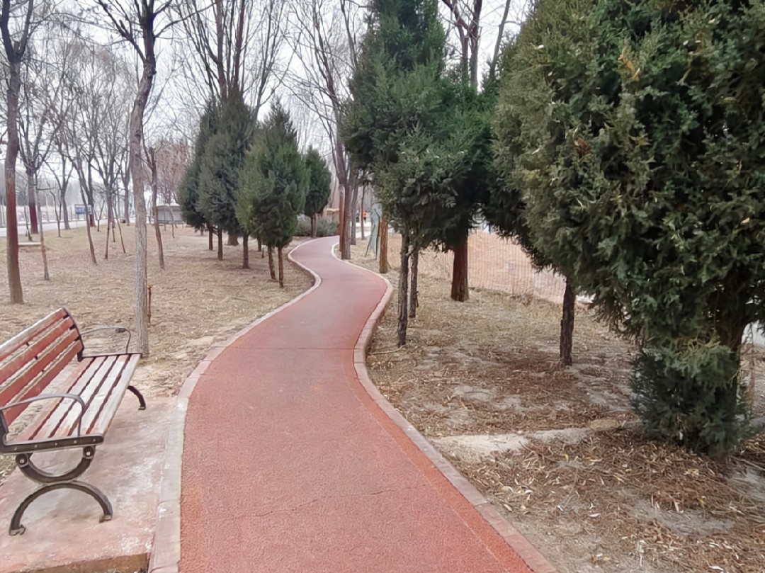 青铜峡市裕民街道紫薇社区围绕社区小广场,用塑胶铺装,画上明显标识,设置安全提示标识与减速带,打造彩色步道,同时满足散步与跑步需求。